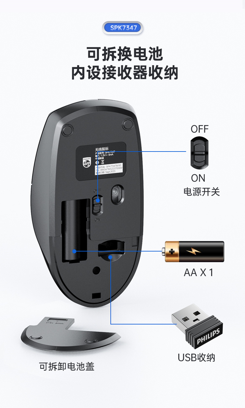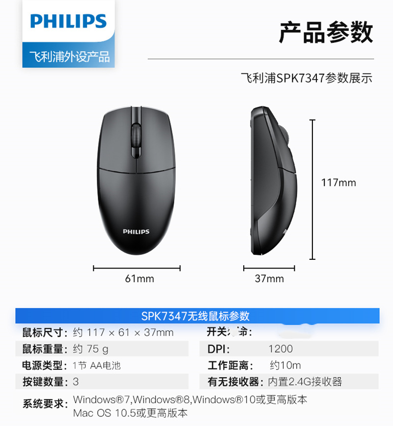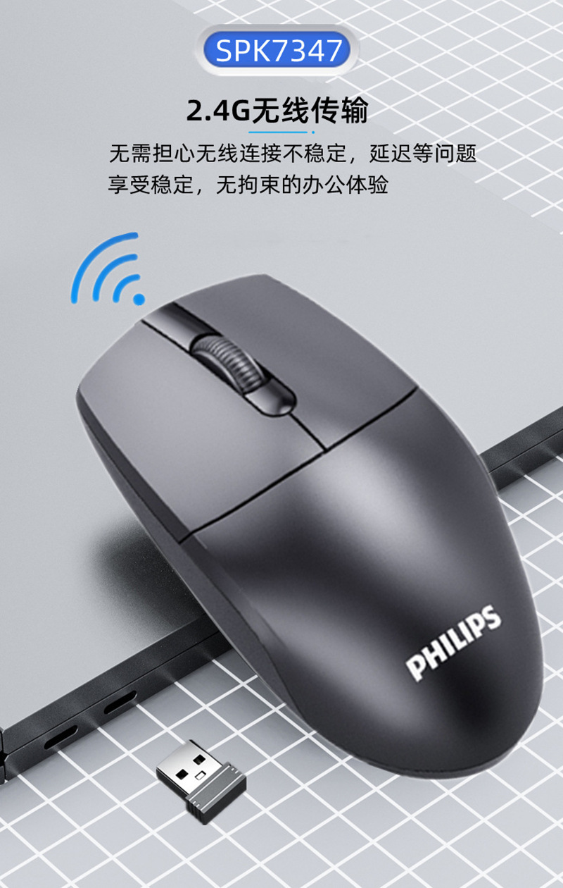Philips/飞利浦SPK7347笔记本台式电脑2.4G无线鼠标 家用办公